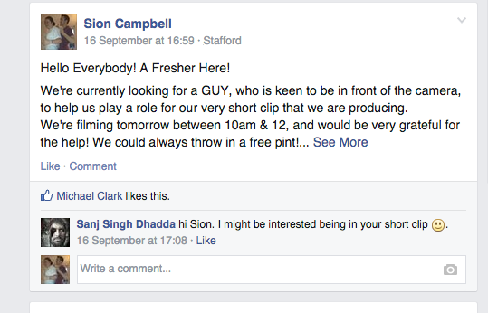 I decided that I was to create a form of advertisment for the roles via Facebook, on both Staffordshire Uni Tech Group & Staffordshire Freshers Group. I was fortunate to recieve two responses from students, in which I was able to make new friends, whilst also making new contacts for future references!